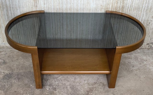 Oval Smoked Glass And Wood Coffee Table With Two Nesting Stools 1970s Set Of 3 For Sale At Pamono